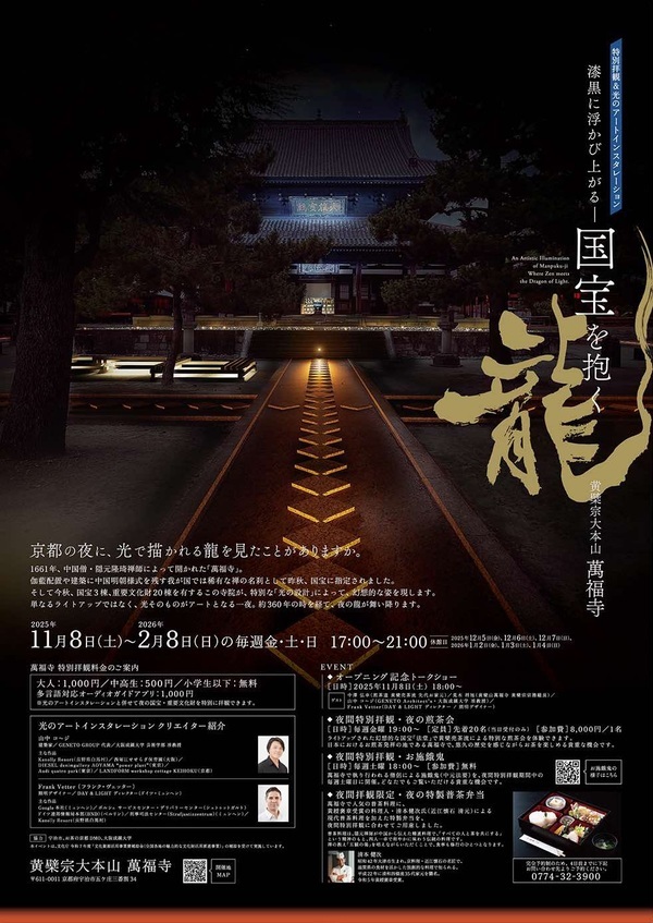 1661年、中国僧?隠元隆琦禅師によって開かれた「萬福寺」。 伽藍配置や建築に中国明朝様式を残す我が国では稀有な禅の名刹として昨秋、国宝に指定されました。そして今秋、国宝3棟、重要文化財20棟を有するこの寺院が、特別な「光の設計」によって、幻想的な姿を現します。 単なるライトアップではなく、光そのものがアートとなる一夜。 約360年の時を経て、夜の龍が舞い降り ます。