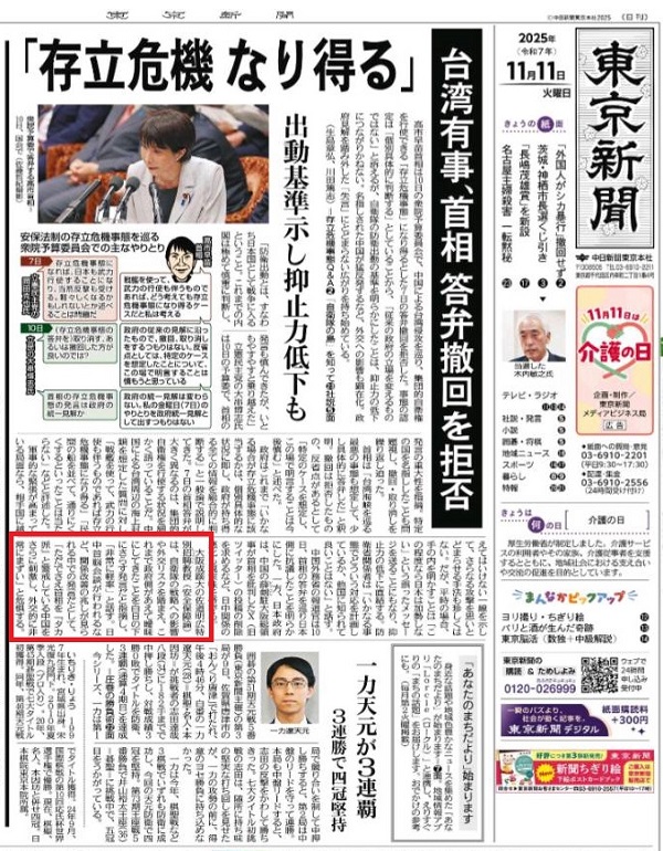 佐道 明広 教授のコメントが東京新聞(11月11日付朝刊)1面に掲載されました
